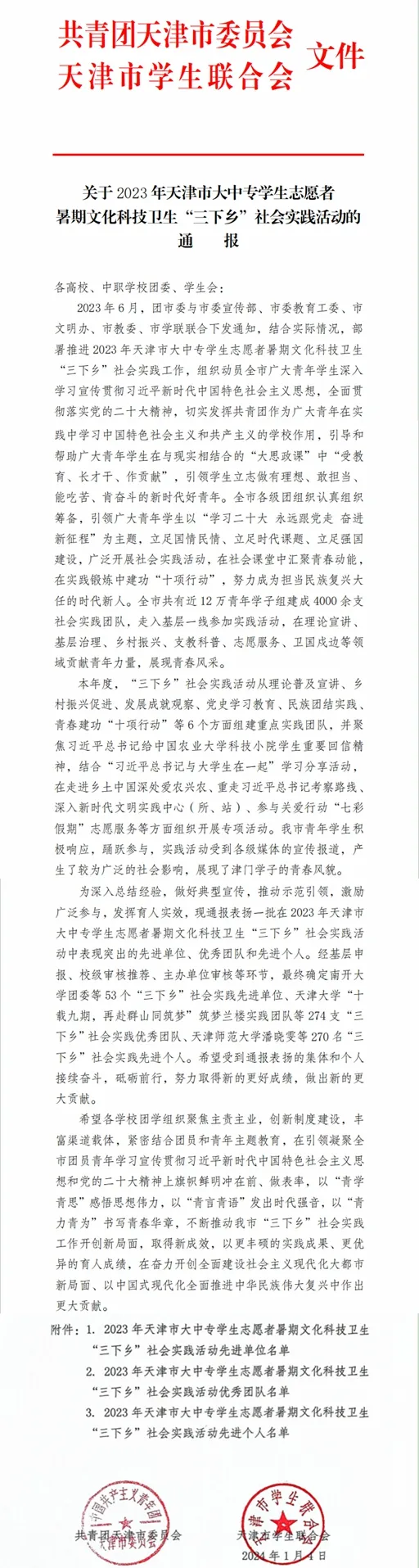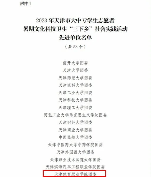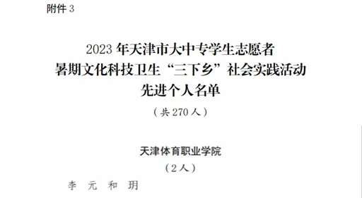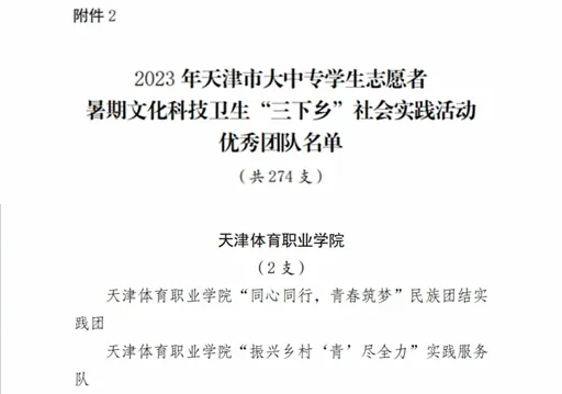 日前,共青团天津市委员会🗓、天津市学生联合会对在2023 年天津市大中专学生志愿者暑期文化科技卫生“三下乡”社会实践活动中表现突出的先进单位🧣、优秀团队和先进个人进行通报表扬🔵,我院荣获多项荣誉🥺。其中,学院团委组建的“同心同行🚶🏻♀️➡️👮♀️,青春筑梦”民族团结实践团(带队教师张强)🦵、“振兴乡村‘青’尽全力”实践服务队(带队教师李元)获评优秀团队,院团委委员李元📰🥗、体育保健与康复系2021级2班学生和玥获评先进个人🙋🏽,我院获评先进单位。
