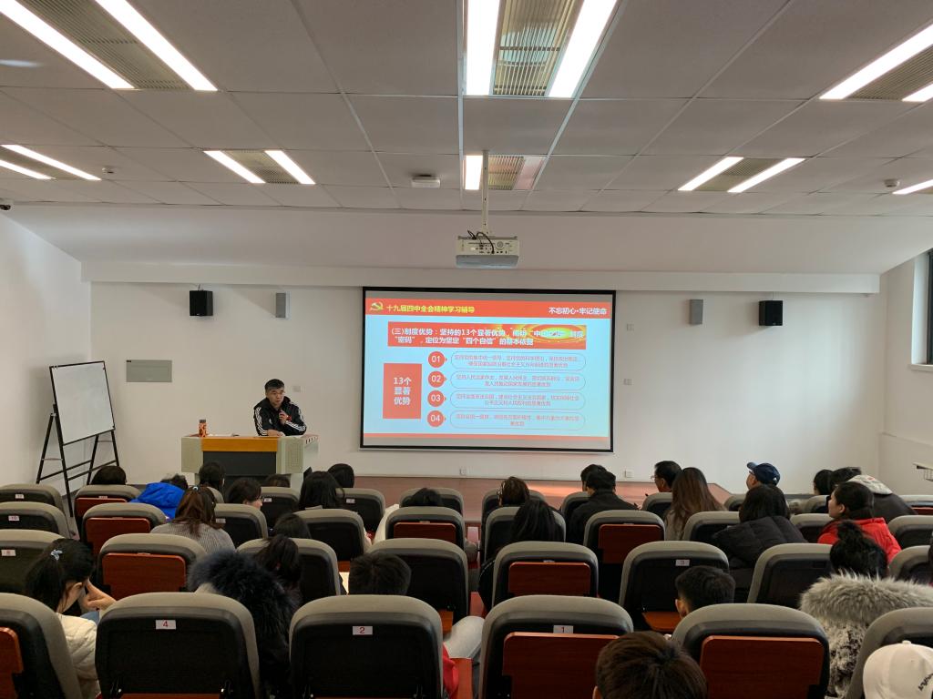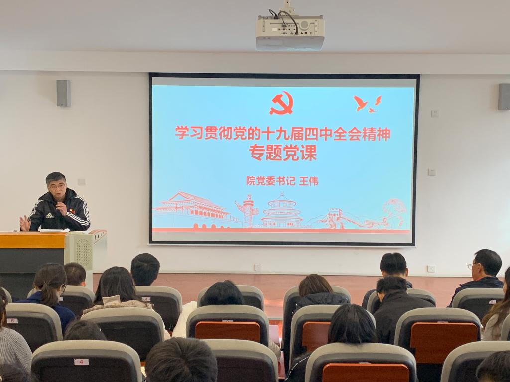 为深入学习宣传贯彻党的十九届四中全会精神,按照局党委、市委教育两委的部署要求,1127日上午🏆,学院党委书记王伟在第一阶梯教室讲授党的十九届四中全会精神专题党课🫏。院纪委书记沈茹劼、全体教职员工、部分团员干部和学生入党积极分子参会👨🏼‍⚕️。