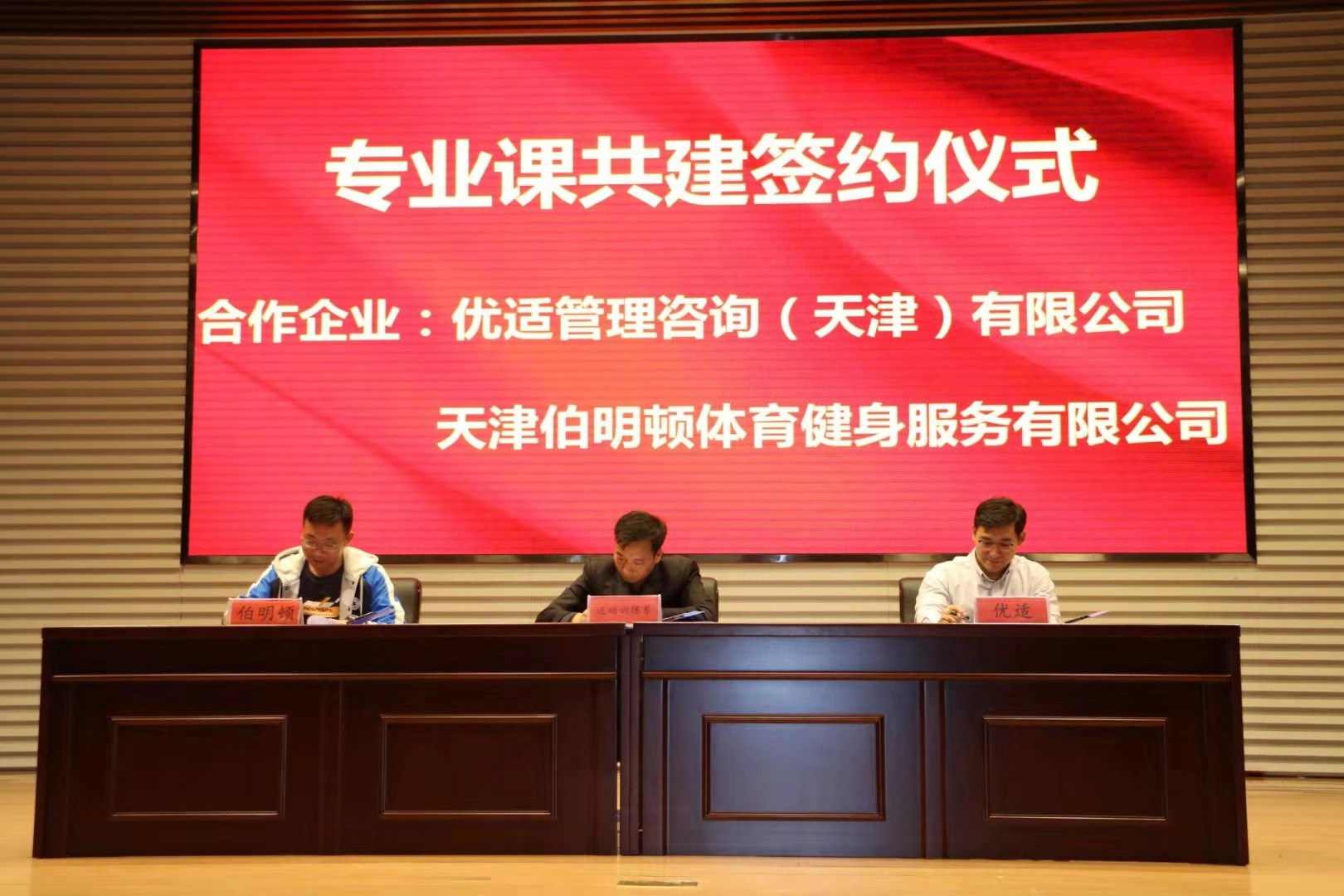 随后,院运动训练系主任潘政彬用多媒体方式从多个方面向参会企业嘉宾介绍运动训练专业发展情况,结合实例深入浅出讲解了学院专业特色🚵🏼、专业定位以及发展趋势。运动训练专业2017级同学王贵杰和毛艺杰作为优秀学生代表上台分享在企业的工作经历和感悟🧖‍♂️。分享结束后,潘政彬与优适管理咨询(天津)有限公司总经理邢恩源、天津伯明顿体育健身服务有限公司总经理李元签订了专业课共建合作协议。学院领导为各位企业家颁发聘书,为多位校内指导专家颁发证书🥬。