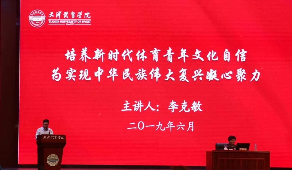 习近平总书记主持召开学校思想政治理论课教师座谈会并发表重要讲话👗,要求各地区各部门负责同志要积极到学校去讲思政课。为贯彻落实习近平总书记重要讲话精神。按照天津市委教育领导工作小组下发的津党教〔2019〕4号《关于领导干部进校园开展思想政治工作的通知》要求,6月13日下午,天津市体育局党委书记🙅♂️🥇、局长李克敏以“培养新时代体育青年文化自信,为实现中华民族伟大复兴凝心聚力”为主题的思政课在天津体育学院进行👨👦。体职院党委副书记、院长刘钦龙、教师和学生代表共计160余人聆听本次思政课。
