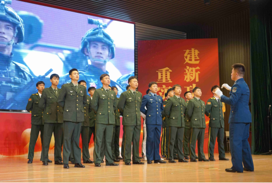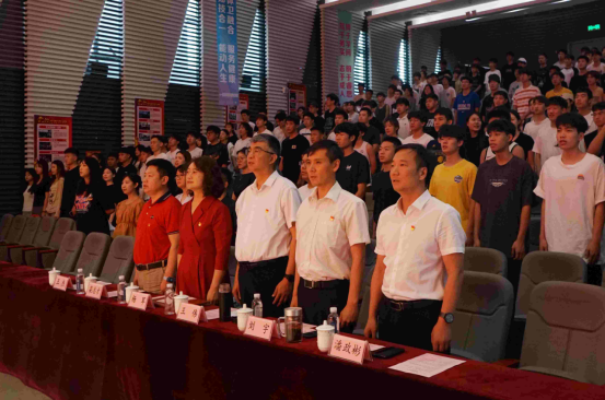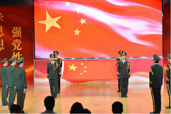 在全场的庄严注目下,学院国旗护卫队出旗,全场奏唱中华人民共和国国歌。