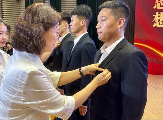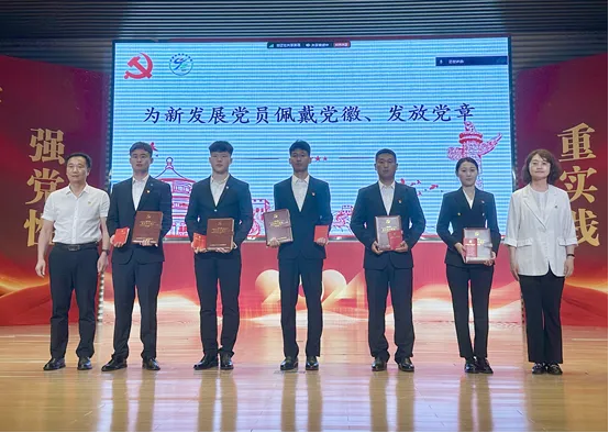 学院党委书记杨军❣️、学院党委委员、副院长潘政彬为新发展党员佩戴党徽、发放党章💁🏿。