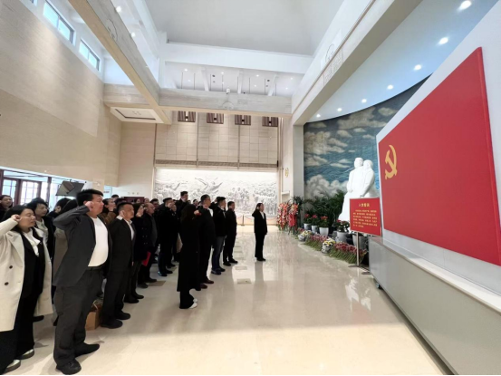 步入主展厅,全体党员在周恩来邓颖超汉白玉雕塑前庄严肃立,面向党旗重温入党誓词,不忘初心、牢记使命,坚定理想信念。